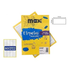 Etiqueta Adesiva 44,4Mm X 12,7Mm 80/Folha Caixa Com 100 Folhas Etiqueta adesiva 44,4mm x 12,7mm Modelo 6187 Cod 49222-3 Marca maxprint Caixa com 100 folhas 80 etiquetas por folha Tamanho carta Para impressão em jato de tinta laser ou copiadora A Etiqueta para Impressora a Laser 492223 da Maxprint é um adesivo acrílico permanente ideal para ser Utilizado em impressão inkJet laser e Copiadora. Resistente ao calor melhor adesão e durabilidade é compatível com o código de mercado. Perfeita para atender ás suas necessidades! Marca: Não Informado Ean: 7897975002558