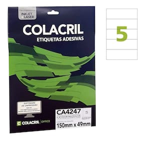 Etiqueta Adesiva Colacril A4 CA4247 150x49mm 25Fls As etiquetas Colacril podem ser utilizadas em casa ou no trabalho, assim mantendo a organização e a identificação. Ideal para uso em caixas, correspondências, documentos, pastas, pequenos objetos, código de barras, mala direta, encomendas, separação de materiais, arquivos, entre outros. - Marca: Colacril- Modelo: Etiqueta Adesiva- Referência: CA4247- Cor: Branco- Etiqueta retangular- Formato da folha: A4- Contém 125 etiquetas- 05 etiquetas por folha e 25 folhas por embalagem- Impressão: Inkjet e Laser- Dimensões da etiqueta: 15 x 4,9cm LxA - Composição: papel com adesivo acrílico