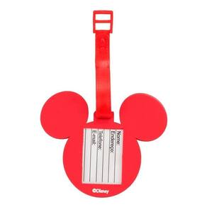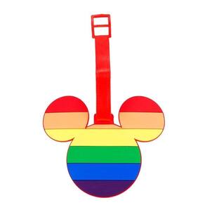 Etiqueta de identificação de bagagem no formato do rosto do Mickey com cores do arco-íris. Interior com pequena folha para preencher nome, endereço, telefone e email. Coleção orgulho LGBT+. Material: silicone