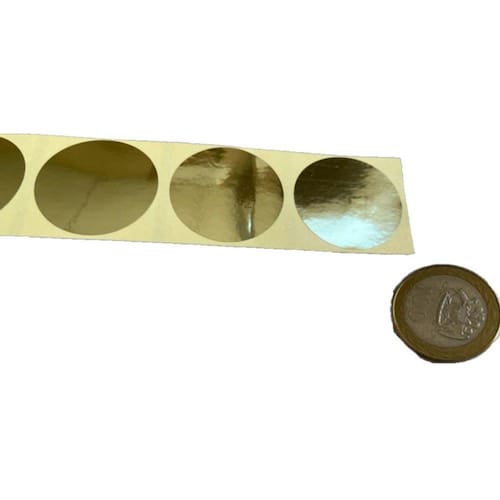 Rolo de 500 etiquetas adesivas redondas Golden Bright Label Diâmetro: 30 mm Você pode imprimi-las (usando fita de resina preta ou prateada), escrever nelas com um lápis especial ou usá-las apenas para selar envelopes, caixas, etc.Material: plástico PET Cone interno (para impressão na impressora): 1 polegada. Impressão por transferência térmica (usando fita de resina). Inclui “Tampas” (linha preta) para que o sensor da impressora as detecte e possa ser impressa sem problemas. Impressoras : Godex G300. EZ120. G500, RT700 Zebra: GK420t, GC420t, ZD220, TLP2844