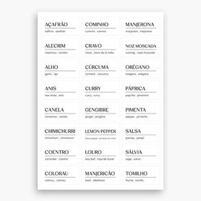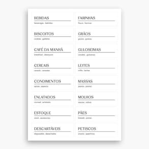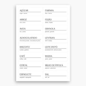 3 Cartelas com Etiquetas Adesivas Para Temperos, Mantimentos e Despensa Adesivos Temperos: Açafrão, Cominho, Manjerona, Alecrim, Cravo, Noz Moscada, Alho, Cúrcuma, Orégano, Anis, Curry, Páprica, Canela, Gengibre, Pimenta, Chimichurri, Lemon Pepper, Salsa, Coentro, Louro, Sálvia, Colorau, Manjericão, Tomilho. Adesivos Mantimentos: Açúcar, Farinha, Arroz, Feijão, Aveia, Granola, Achocolatado, Lentilha, Biscoito, Leite em Pó, Café, Massa, Cereal, Milho de Pipoca, Espaguete, Sal. Adesivos Despensa: Bebidas, Farinhas, Biscoitos, Grãos, Café da Manhã, Guloseimas, Cereais, Leites, Condimentos, Massas, Enlatados, Molhos, Estoque, Pães, Descartáveis, Petiscos.