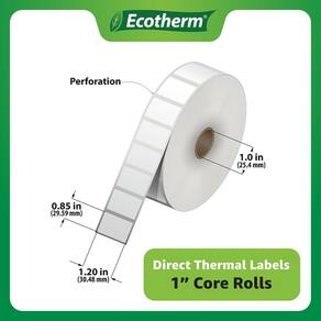 Ecotherm 1,2 x 0,85 etiquetas térmicas diretas em um rolo - O diâmetro do núcleo do rolo é de 2,5 cm - O diâmetro externo do rolo não excede 12,7 cm - Compatível com impressoras Zebra: ZD220, ZD410, ZD411, ZD421, ZD620, ZD621, GC420, GK420, GX430, LP2824, LP2844, ZP500. - Resistente à luz UV. Temperatura de serviço: -4F a 158F. Qualidade de impressão: impressão clara e de alto contraste sem manchas ou desbotamento ao longo do tempo. - Fácil de descascar: com um adesivo permanente à base de borracha de alta aderência para caixas, papelão, vidro, caixas onduladas, paletes, metal, papel, plástico bolha, sacos de poliéster, embalagem retrátil e correspondências. - Segurança: as etiquetas térmicas Ecotherm Direct são livres de BPA, garantindo que sejam seguras para uso em embalagens de alimentos e outras aplicações onde a segurança do produto é uma preocupação. - As aplicações incluem: etiquetas de envio, etiquetas de preço, etiquetas de código de barras, etiquetas de inventário, etiquetas FBA, etiquetas de endereço, etiquetas de pasta de arquivo, etiquetagem em processo de trabalho e muito mais
