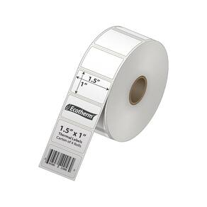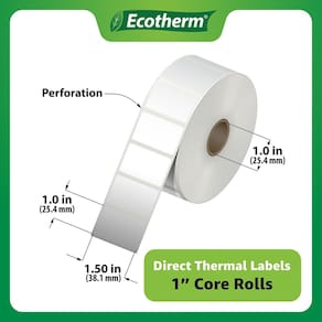 Ecotherm 1,5 x 1 etiqueta térmica direta em um rolo - O diâmetro do núcleo do rolo é de 2,5 cm - O diâmetro externo do rolo não excede 10 cm - Compatível com impressoras Zebra: ZD220, ZD410, ZD411, ZD421, ZD620, ZD621, GC420, GK420, GX430, LP2824, LP2844, ZP500. - Resistente à luz UV. Temperatura de serviço: -4F a 158F. Qualidade de impressão: impressão clara e de alto contraste sem manchas ou desbotamento ao longo do tempo. - Fácil de descascar: com um adesivo permanente à base de borracha de alta aderência para caixas, papelão, vidro, caixas onduladas, paletes, metal, papel, plástico bolha, sacos de poliéster, embalagem retrátil e correspondências. - Segurança: as etiquetas térmicas Ecotherm Direct são livres de BPA, garantindo que sejam seguras para uso em embalagens de alimentos e outras aplicações onde a segurança do produto é uma preocupação. - As aplicações incluem: etiquetas de envio, etiquetas de preço, etiquetas de código de barras, etiquetas de inventário, etiquetas FBA, etiquetas de endereço, etiquetas de pasta de arquivo, etiquetagem em processo de trabalho e muito mais