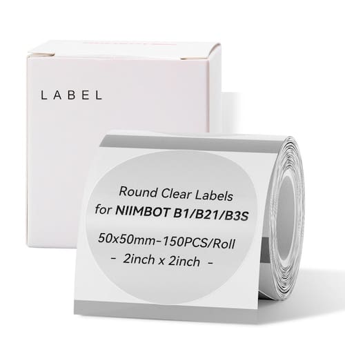 Etiquetas NIIMBOT para impressora de etiquetas B1/B21/B3S/K3, etiquetas térmicas de 2 “x 2" (50 x 50 mm), etiquetas adesivas impermeáveis e à prova de óleo, 1 rolo de 150 etiquetas adesivas (redondas transparentes)