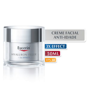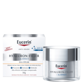 Creme anti-idade para todos os tipos de pele, inclusive peles secas à mistas. Eucerin Hyaluron-Filler Diurno FPS 30 combate as rugas e os sinais de envelhecimento, além de oferecer proteção UVA/UVB.