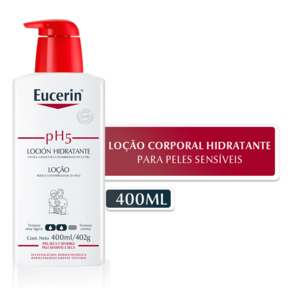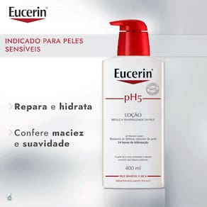 Loção hidratante corporal para peles sensíveis. Eucerin pH5 promove ação reparadora e hidratante, respeitando o pH fisiológico e conferindo maciez e suavidade.