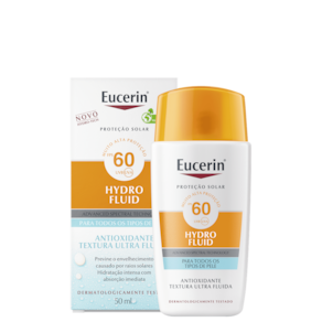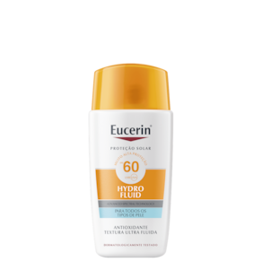 Protetor solar facial. Eucerin Sun Hydro Fluid FPS 60 é indicado para todos os tipos de pele, possui textura hidro fluída que permanece confortável na pele e é fácil de aplicar.