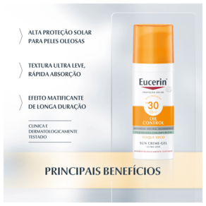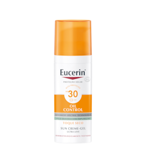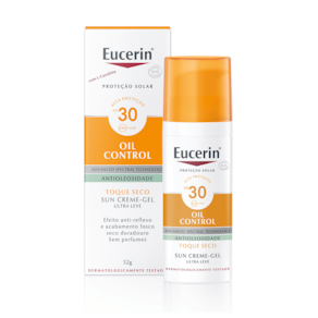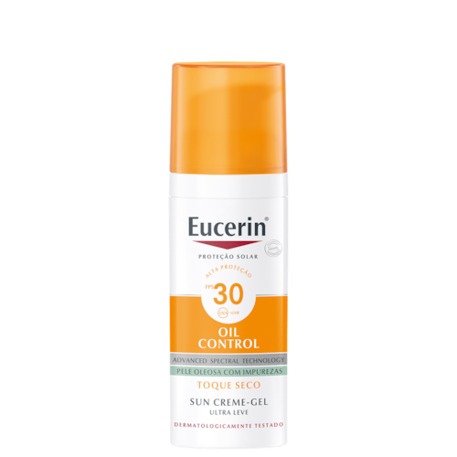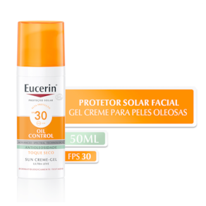 Protetor solar facial para peles oleosas e com tendência à acne. ?Eucerin Sun Oil Control FPS 30 traz efeito matificante de longa duração, ajuda a controlar a oleosidade e possui toque seco imediato.