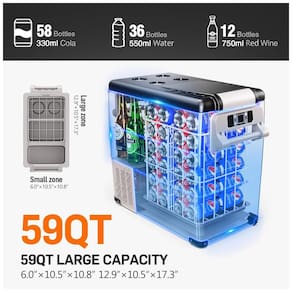 DUPLA ÁREA DE ZENAMENTO E POTENTE CAPACIDADE O refrigerador de carro Euhomy está equipado com duas zonas, divididas em zona de refrigerador de 10L e zona de freezer de 45L. As áreas de zenamento duplas podem reduzir o odor. O freezer portátil da geladeira permite que você zene uma variedade de alimentos enquanto mantém a geladeira limpa. Este poderoso refrigerador rv 690 345 pode conter 58 garrafas de 330ml de cola, ou 36 garrafas de 550ml de água ou 12 garrafas de 750ml de vinho tinto, o que atende totalmente às suas necessidades.