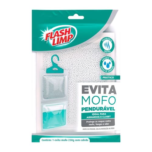 O Evita Mofo Pendurável, da Flash Limp absorve a umidade dos ambientes, evitando que roupas e outros objetos sejam acometidos por mofo, fungos e odor. Proteja suas roupas e sua saúde. O tempo de duração do evita mofo varia conforme a umidade e o tamanho do local onde ele estará agindo.