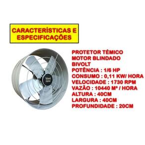 Exaustor e ventilador ex40 codigo 0255 bivolt / motor blindado Utilizado para renovar o ar em industrias, galpões comerciais em ambientes com a temperatura máxima de 40 Grande vazão: Alta capacidade de vazão e ventilação. Versatilidade na instalação: Pode ser instalado em paredes e dutos de ventilação. Acompanha chave de controle: Reverte o movimento entre ventilação e exaustão. Características e especificações: Tensão: bivolt Equipado com protetor térmico Motor blindado Potência: 1/6 hp Consumo: 0,10 kw/h Velocidade: 1730 rpm Vazão: 10.440 m3/h Altura: 30 cm Largura: 30 cm Profundidade: 20 cm Peso: 3,990 kg : 1 ano Marca: Não Informado