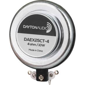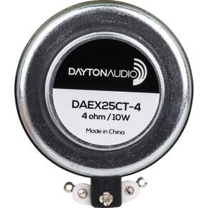 Dayton Audio DAEX25CT-4 Exciter tipo moeda 25 mm 10 W 4 Ohm - Tamanho pequeno; pouco menos de 5 cm de diâmetro, cerca de 1,4 cm de altura - Adesivo 3M VHB pré-aplicado para instalação rápida e durável - Motor de neodímio de terras raras e uma bobina de voz proprietária - Impedância de 4 ohm para uso com pequenos amplificadores de classe D - Bobina de voz de 2,5 cm para manuseio de energia RMS de 10 watts