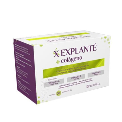 Explante + Colágeno é um suplemento alimentar em pó, desenvolvido para complementar a ingestão diária de colágeno hidrolisado. Apresenta sabor agradável de frutas vermelhas e vem em sachês práticos de 12g cada, ideais para consumo diário e transporte.