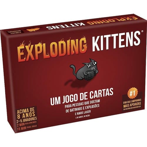 Exploding Kittens é uma versão da Roleta Russa altamente estratégica movida a gatinhos. Os jogadores fazem seus turnos comprando cartas até que alguém compre um gatinho explosivo e perca o jogo. O baralho é formado de cartas que permitem a você evitar a explosão espiando a carta antes de comprá-la, forçando seu oponente a comprar múltiplas cartas ou embaralhando a pilha de compra. O jogo fica mais e mais intenso a cada carta que você compra porque quanto menos cartas disponíveis no baralho, maior a chance de comprar um gatinho e explodir em uma gigantesca bola de fogo felino. COMPONENTES - 56 cartas no tamanho 63 x 88mm - Folheto de regras