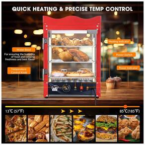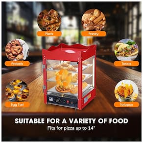 O Expositor Aquecedor de Alimentos Comercial WeChef 3 Andares de 600W apresenta estrutura em aço inoxidável 430 com moldura vermelha e design de coroa superior para exibição atrativa de pizzas, pretzels, tacos, totopos, hambúrgueres e tortas de ovo. Equipado com tiras de LED warm white 3000K em ambos os lados, ilumina os alimentos de forma uniforme, destacando sua aparência fresca e lustrosa através de vidro temperado de alta definição em todas as direções, otimizado para visibilidade em restaurantes, padarias, cafés e food trucks.