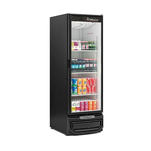 Expositor Refrigerador Vertical de Bebidas 578L GRV57 Gelopar. Conservação e exposição de bebidas, frios e laticínios. Refrigeração por ar forçado com evaporador aletado. Temperatura: 0º a +7ºC. Degelo: Automático (frost free). Controle de Temperatura: Termostato. Iluminação interna LED. Porta de vidro duplo temperado baixo emissivo com fechamento automático. Prateleiras: 3 níveis reguláveis e inclináveis. Pés niveladores. Vidros sujeitos a condensação da umidade do ar. ARMAZENAMENTO: 512 latas 350ml, ou 324 long necks 350ml ou 256 garrafas pet 600ml. TEMPERATURA:0 a +7ºC. CAPACIDADE: 578L. PESO: 89Kg. CONSUMO: 3,72 kWh/dia. DIMENSÕES EXTERNAS (CxAxL): 64,5x196x79,4cm. Equipamento certificado conforme Portaria Inmetro nº 371/2009.