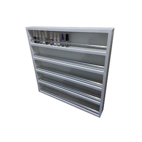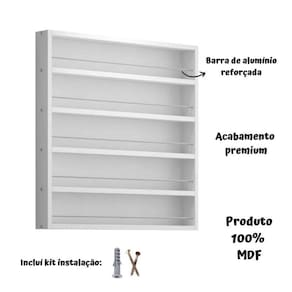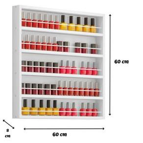 Chegou a hora de organizar e expor seus esmaltes da melhor forma possível: com qualidade e segurança expositor de esmaltes desenvolvido com mdf 100% e inclui uma barra de alumínio em cada prateleira desse expositor, garantindo assim a segurança dos seus esmaltes na hora de colocar e/ou tirar das prateleiras Expositor de parede para esmaltes com proteção de barra alumínio na frente. Produto 100% mdf barra de aluminio em alta qualidade Quantidade aproximada de esmaltes no expositor: 250 esmaltes dependendo do tamanho e formato dos esmaltes Medidas: 60 cm comprimento x 60 cm altura x 8 cm largura. Espaço de 10,5 cm de altura entre as prateleiras. São 5 prateleiras com proteção de alumínio + 1 prateleira na parte de cima. Capacidade para cerca de 250 esmaltes, sendo um do lado do outro e atrás do outro os esmaltes não acompanham o expositor Material: 100% mdf 15mm de espessura muito resistente Cor: mdf branco acabamento melânico tx fosco Bem mais resistente a riscos e danos cantoneiras já vão fixadas em mdf . Já enviamos o produto montado, só fixar na parede já incluso buchas e parafusos para instalação. Recomendado para ambientes como: salões de beleza, manicure, esmalteria, perfumaria e para uso residenciais. Produto com fundo vazado / sem fundo, para ser fixado na parede. Marca: Não Informado