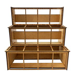 Material: MDF cru de alta qualidade Medidas Aproximadas: (LxA) 18 x 26 Cor: Natural (pode ser pintado ou envernizado conforme desejar) Formato: 3 andares com divisórias individuais Estrutura firme e durável Cada espaço comporta 3 caixas de incenso, totalizando 36 incensos no expositor completo Design artesanal, feito com precisão e ótimo acabamento
