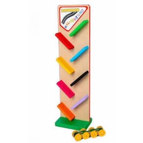 O Brinquedo acompanha um carrinho de madeira como da foto que desce rapidamente a rampa e desliza pelo chão.