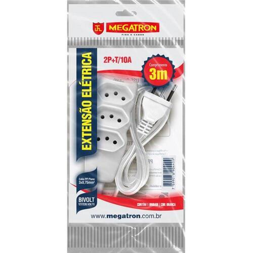 EXTENSAO 3 TOM. PARAL.3X0,75X3,00MT 2P+T 10A/250V BR MEGATRONApresentamos as extensões elétricas 2P T, produtos de qualidade e que garantem segurança aos usuários, atendendo ao novo padrão brasileiro de plugues e tomadas (NBR 14136). Este produto é produzido com cabo PP, que as torna ainda mais resistentes.Modelo: Extensão Elétrica Megatron 2P TAmperagem: 10A / 250VCabo: PPEspessura do Cabo: 0,75mm²Número de tomadas: 03Ideal para: Uso residencial e comercial*Imagens meramente ilustrativa.*Marca: MegatronCódigo:79885