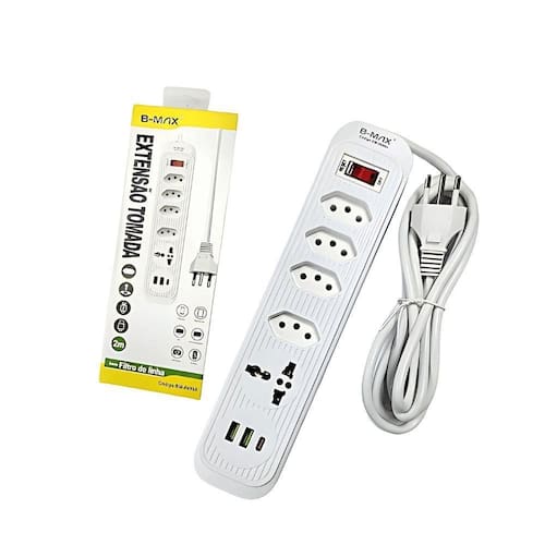 Extensão 3 Tomadas - Tripolar - Usb/type-c - B-max A extensão BMAX é a solução ideal para quem busca praticidade e segurança no uso de múltiplos dispositivos. Com três tomadas tripolares, uma entrada para plugue europeu padrão UK, duas portas USB e uma porta USB-C, ela oferece versatilidade para conectar diversos aparelhos simultaneamente. Possui proteção contra sobrecorrente, garantindo mais segurança para seus equipamentos. Seu cabo de alimentação de 200 cm oferece maior alcance, e sua potência nominal é de 2500W (10A), com tensão de operação entre 110V e 220V. As portas USB fornecem corrente de até 2.1A, ideal para carregar celulares, tablets e outros dispositivos com eficiência. Código: 105551 Dimensões aprox. da embalagem em cm: 5x11x28 Peso liq. Aproximado do produto na embalagem: 400g Referência do Modelo: BM-8699A Conteúdo da Embalagem: 01 Extensão com com 03 tomadas tripolares, 02 entradas USB, 01 entrada USB-C e 01 entrada padrão europeu UK Composição/material: Plástico e componentes elétricos Garantia: 90 dias contra defeitos de fabricação pelo fabricante. Imagens meramente ilustrativas. As cores e tonalidades podem variar. Tipo - Extensões Filtros