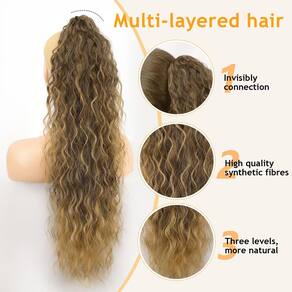 - INTRODUÇÃO DO MATERIAL: Nossas extensões de rabo de cavalo são feitas de fibras sintéticas premium. Seguro, confortável e bonito. Toque com as mãos tão macias quanto o cabelo. Comprimento: ondulado de 30 polegadas Peso: 160g