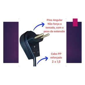Extensão Elétrica com cabo pp emborrachado super reforçada Comprimento 5 Metros Cabo Pp2x1,5 mm Plug Macho com dois pinos de 10 Amperes pino Fino Tomada Femeá em barra Dupla de 20 Amperes serve Pino Fino e Pino Grosso Capacidade de Carga desta Extensão ligada em 127 volts e de 1800W Capacidade de Carga desta Extensão ligada em 220 volts e de 3000W