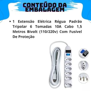 Características Principais:Multiplique Suas Tomadas: Com 6 tomadas elétricas, você pode conectar vários dispositivos simultaneamente, tornando seu espaço mais funcional.Padrão NBR14136 (2P+T): Compatível com o padrão brasileiro de tomadas, garantindo segurança e confiabilidade.Chave ON/OFF: Controle fácil para ligar e desligar a extensão, proporcionando praticidade e economia de energia.Fusível de Proteção: Inclui um fusível para proteger seus dispositivos contra sobrecargas e curtos-circuitos.Corrente Máxima: Suporta até 10A, ideal para a maioria dos eletrodomésticos e eletrônicos.Tensão de Operação: Funciona em tensões de 127-220 Vac, oferecendo versatilidade para diferentes necessidades.Comprimento do Cabo: Cabo de 1,5 metros, proporcionando alcance suficiente para diversas situações.Especificações:Número de Tomadas: 6Padrão: NBR14136 (2P+T)Chave: ON/OFF com cordão de 3 x 0,75mmCorrente Máxima: 10ATensão de Operação: 127-220 VacComprimento do Cabo: 1,5 metrosComposição: Termoplástico e metaisCores: BrancoBenefícios:Segurança: Fusível de proteção contra sobrecargas e curtos-circuitos, mantendo seus dispositivos seguros.Praticidade: Aumente o número de tomadas disponíveis com facilidade e organize melhor seus equipamentos.Versatilidade: Ideal para uso residencial e comercial, suportando uma ampla gama de aparelhos.Atenção:Não é um estabilizador de tensão: Esta extensão elétrica não regula a tensão da rede elétrica.