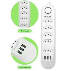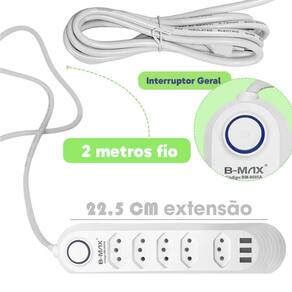 Extensão Filtro de Linha BMAX com 5 Tomadas e 3 USB - Cabo 2 Metros