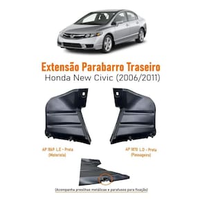 Extensão para-barro para-lama traseiro honda new civic lado esquerdo Aplicações: New civic: 2006 a 2011 Cor: preto Especificações tecnicas: Excelente acabamento Material feito em plástico resistente Fixação firme e encaixe perfeito Fácil instalação Acompanha presilhas metálicas Acompanha parafusos de fixação Conteudo da embalagem: 01 extensão parabarro new civic de 3 meses sobre defeitos de fabricação; Não nos responsabilizamos pelo mau uso ou instalação inadequada do produto; Recomendamos que a instalação seja feita por profissional especializado. A jcb agradece sua preferência. Estamos à disposição para melhor atendê-los Marca: Não Informado
