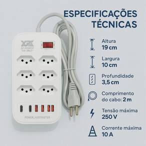 - Comprimento: 2 metros - Número de tomadas: 6 - Número de portas USB: 4 - Número de portas USB-C: 2 - Material: Plástico resistente