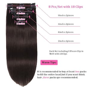 Feitas com 110% cabelo humano real, essas extensões adicionam comprimento e volume, dando a você o visual lindo e completo que você deseja. Se você deseja adicionar cachos saltitantes, destaques vibrantes ou uma cor completamente nova, essas extensões podem ser personalizadas para se adequar ao seu estilo e preferências únicos. Diga adeus aos cabelos lisos e sem vida! Ninguém será capaz de dizer que você está usando extensões! Você terá a confiança de arrasar com qualquer penteado com facilidade. As extensões de cabelo preto combinam perfeitamente com o seu cabelo natural, dando a você um resultado deslumbrante e autêntico. Conforto e proteção são fundamentais, e é por isso que nossas extensões de cabelo com clipe apresentam clipes de aço inoxidável duráveis cobertos com borracha macia. Estes clipes fornecem uma fixação segura enquanto garantem conforto e protegem seus preciosos fios de danos. Você pode usar suas extensões o dia todo sem qualquer desconforto ou preocupações. Você pode facilmente enrolar, tingir e estilizar como seu cabelo natural. Se você deseja adicionar cachos saltitantes, destaques vibrantes ou uma cor completamente nova, essas extensões podem ser personalizadas para se adequar ao seu estilo e preferências únicos. Diga adeus aos cabelos lisos e sem vida! Atualize seu visual com nossas extensões de cabelo humano real e experimente a transformação em primeira mão. Adicione comprimento, volume e estilo ao seu cabelo sem esforço e abrace a beleza e a confiança que vem com ele. Não aceite cabelos comuns. Alcance o comprimento, o volume e o estilo que você sempre quis, mantendo a aparência autêntica do seu cabelo natural. - Adequado para iniciantes: Projetado para sua conveniência, as extensões de cabelo com clipe facilitam para alcançar o comprimento e o volume que você deseja em um instante. Sem complicações, apenas fechaduras impecáveis. - Ótima qualidade: com nossas extensões de cabelo com clipe, você pode esperar nada menos do que o melhor cabelo humano 100% real que mostra uma aparência e sensação naturais. - Estilo versátil: abrace sua criatividade e expresse seu estilo único com nossas extensões de cabelo humano real. Enrole, tinga e estilize para infinitas possibilidades e visuais deslumbrantes. - Integração sem costura: Meticulosamente trabalhada para se misturar perfeitamente com o seu cabelo natural. Os clipes de aço inoxidável duráveis, cobertos com borracha macia, proporcionam conforto e protegem seus preciosos fios. A técnica de trama dupla garante longevidade e um resultado impecável. - Transformação instantânea: prepare-se para chamar a atenção onde quer que você vá, pois nossas extensões de cabelo com clipe estão aqui para ajudar você a liberar sua deusa interior. Desfrute de glamour instantâneo e um novo visual incrível que deixará todos admirados.