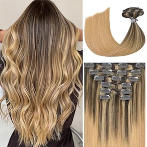 Nossas extensões de cabelo se misturam naturalmente com o seu próprio cabelo e podem ser lavadas, secadas, chapadas e/ou enroladas usando ferramentas quentes, assim como seu próprio cabelo, sem queda, sem emaranhados, sem cheiro, macio e sedoso. A combinação de 7 peças é flexível para usar à sua escolha. Os clipes já estão presos e o conjunto está pronto para uso instantâneo em apenas 5 minutos sem o incômodo de colas, fitas ou tecidos.