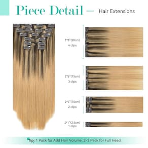 - Especificações de extensões de cabelo humano real -- Extensões de cabelo Balayage cabelo humano real, 7 peças 120 g com 17 clipes por conjunto, 35 cm, #4P10T27. De acordo com o seu próprio volume de cabelo, apenas para engrossar o seu cabelo, aconselhamos comprar 1-2 conjuntos; quer cabeça cheia, conselho comprar 2-3 conjuntos. Quando o peso for o mesmo, o tamanho maior será mais fino do que o tamanho menor.
