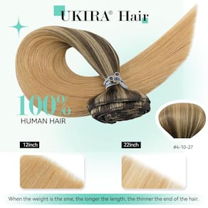 Extensões de cabelo Ukira com clipe de cabelo humano real, extensões de cabelo humano 100% Remy, o cabelo Remy é recolhido da cabeça dos doadores de forma a manter as cutículas do cabelo adequadamente alinhadas em relação aos cabelos vizinhos. Isso significa que o cabelo permanece mais macio, sedoso e mais saudável do que o cabelo humano comum. Quando lavado, não fica emaranhado e emaranhado.