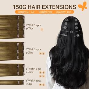 - Extensões de cabelo 150 g de peso – Super espesso: cada conjunto inclui 9 peças com 20 clipes, pesando 132 g sem clipes e 150 g com clipes. Melhoramos a versão autêntico de 120 g adicionando 2 peças de trama de 2 clipes. Um pacote adequado para a maioria das necessidades
