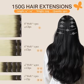 - Extensões de cabelo 150 g de peso – Super espesso: cada conjunto inclui 9 peças com 20 clipes, pesando 132 g sem clipes e 150 g com clipes. Melhoramos a versão autêntico de 120 g adicionando 2 peças de trama de 2 clipes. Um pacote adequado para a maioria das necessidades