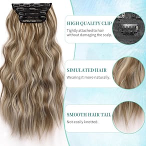 KooKaStyle Extensões de cabelo sintético com clipe em extensões de cabelo longo ondulado 4 peças de cabelo grosso marrom mistura loiro acinzentado P10/88 extensões de cabelo natural trama dupla 50 cm para mulheres - ?Mais volume? -- Com 190 g 50,8 cm, cada pacote inclui: 2 peças de 12,7 cm de largura, 2 clipes em trama; 1 peça de 15 cm de largura 3 clipes em trama; 1 peça de 18 cm de largura e 4 clipes em trama. - ?Efeito após o uso?--Pode fazer seu cabelo parecer mais natural e esta extensão de cabelo pode fazer seu cabelo parecer mais longo, mais grosso, o que é muito fácil de usar. Você pode aparar e remodelar seu estilo de cabelo de acordo com o comprimento do seu próprio cabelo. - ?Mais confortável e saudável?-- Trama dupla é usada em vez de trama única. Ao usar produtos de extensão de cabelo, haverá uma ligeira perda de cabelo, o que é normal. Os clipes de aço inoxidável antiderrapantes são bem costurados em cada trama com firmeza, fáceis de usar e tirar como quiser, nunca machucam seu couro cabeludo. - Aberração cromática: todos os produtos desta loja são fotos reais; pode haver pequenos desvios devido à tecnologia, exibição, luz, ambiente, etc., consulte o produto real. - ?Como cuidar? - Ao contrário do seu próprio cabelo, as extensões de cabelo podem ficar emaranhadas sem nutrientes. Use um spray desembaraçante ou pegue um frasco de spray, coloque um pouco de condicionador e adicione água. Se não houver condicionador, basta borrifar um pouco de água, para que a extensão do cabelo não fique muito seca e evite emaranhados até certo ponto.