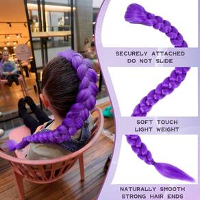 - Material: as longas tranças roxas são feitas de fibras sintéticas. São macias, leves, duráveis e têm uma aparência natural, semelhante a cabelos reais.