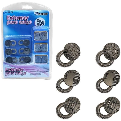 Extensor De Aço Carbono Calca Com 6 Pecas 3,5Cm Na Cartela Informações adicionais: Ean: 7896980423303 Validade: indeterminada Tamanho aproximado: 3,5cm Peso aproximado: 45g Tipo de produto: extensor para calça com 6 peças na cartela Cor: cinza Composição: aço carbono