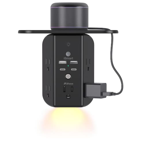 Extensor de tomada de parede - Extensor de tomada de parede 9 em 1: os extensores de tomada são projetados com 5 saídas USB + 2 portas USB A + 2 portas USB-C. O filtro de linha de 3 lados com luz noturna LED e prateleira destacável. Usando o parafuso no meio para prendê-lo na parede para uma tomada duplex, você não correrá o risco de desconectar toda a unidade quando desconectar apenas um cabo. - Extensor de saída com luz noturna inteligente suave: a potência da luz LED é de 1,5 W, liga automaticamente a luz no escuro e desliga a luz ao amanhecer. Sensor de toque embutido, você também pode optar diretamente por ligar/desligar manualmente a luz noturna. A luz é suave e apenas o suficiente para iluminar a área circundante, melhorando a segurança à noite. - Economia de espaço e prateleira removível alargada: nossa prateleira de tomada de parede tira seus dispositivos do balcão e também é capaz de carregar facilmente. Design de 3 lados, para que você possa usá-lo para plugues grandes e de formato estranho que tendem a cobrir outras tomadas. - Protetor contra surtos 1800 J para proteger seus dispositivos caros: o filtro de linha tem uma classificação de energia de 1800 Joule, fornecendo uma régua de linha confiável para proteger impressoras, modems de banda larga, sistemas de home theater e assim por diante. Protege seus dispositivos eletrônicos contra sobrecarga, curto-circuitos, picos de energia, raios ou flutuação.