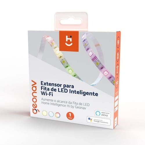 Extensor fita de led inteligente wi-fi uma maneira mais prática de aumentar o alcance da fita de 3 metros, sem precisar cortar e nem utilizar uma fonte com um novo módulo wi-fi, pois basta conectar o extensor em uma das pontas para ampliar o ambiente divertido e inteligente. As cores escolhidas no aplicativo hi by geonav ou por comando de voz com a alexa ou google assistente para a fita principal são replicadas diretamente na extensão sem a necessidade de nenhuma configuração adicional.