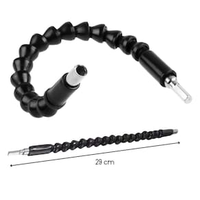 Características do Produto Comprimento: 29cm Material: Plástico ABS resistente com núcleo metálico flexível Compatibilidade: Universal, compatível com parafusadeiras e furadeiras elétricas Acoplamento: Encaixe hexagonal padrão 1/4 Cor: Preto Rotação: Livre com movimentação flexível de 360 Aplicações: Ideal para montagem de móveis, painéis, áreas de difícil acesso, cantos, frestas e locais apertados