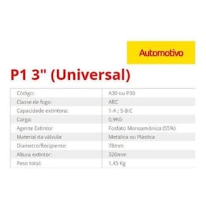 Extintor ABC Automotivo 1Kg Universal/Fino com suporte Válido até 06/2027 Extang