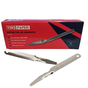 Extrator De Grampo Yin's Paper em Metal Tipo Espátula. Perfeito para facilitar a rotina, o Extrator de Grampo remove grampos de maneira prática sem amassar a folha. INFORMAÇÃO: Alta durabilidade. Fácil utilização. Material: metal galvanizado Acabamento: zincado Medidas extrator : 1,5cm x 15 cm Embalagem: 12 unidades. Cores: Cromado Marca: Yin's Paper do vendedor: 30 dias