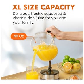 Comece o seu dia com um copo de suco de laranja fresquinho feito na hora! O Extrator de Suco de Citrus Elite Gourmet produz suco de citros perfeitamente espremido, com filtro de polpa e sementes, resultando em três xícaras de suco com a quantidade ideal de polpa, sem sementes. Fácil de desmontar e limpar, este extrator é eficiente e opera com apenas 40 watts. SAUDÁVEL E FÁCIL DE USAR: Extraia o suco diretamente das frutas cítricas, sem aditivos, açúcar extra ou conservantes, preservando as vitaminas, enzimas e nutrientes naturais. TAMANHO IDEAL: Com capacidade para 1,2 litros, é perfeito para 45 porções de suco fresco e saudável, com um bico de despejo conveniente e alça integrada ao recipiente de extração, que conta com um coletor de polpa/sementes. Todas as partes removíveis são seguras para lavar na lava-louças. COMPACTO E LEVE: Uma adição prática para qualquer apartamento, cozinha pequena, vida universitária ou viagens em trailers, ocupando pouco espaço no balcão. FÁCIL DE USAR: O extrator elétrico de movimento automático torna o processo de extração rápido e simples. Basta pressionar para extrair o suco e soltar para parar! SEGURO E AMBIENTALMENTE AMIGÁVEL: Feito com materiais ecológicos, respeitando as normas da FDA e sem plástico BPA. APROVADO PELA ETL FDA. Cor: Preto/Aço Inoxidável.