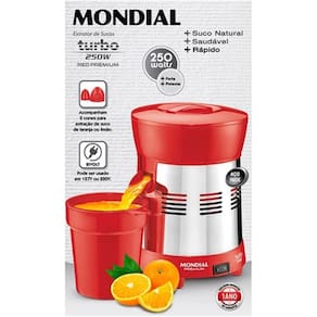 Extrator E-24 60Hz Red Premium Mondial Garanta cafés da manhã muito mais saudáveis, almoço e jantares muito mais saborosos, ou lanches da tarde muito mais nutritivos com o incrível Espremedor Turbo Premium E-24 da Mondial O espremedor da Mondial é ideal para quem busca um item para embelezar a cozinha, com um design moderno e primoroso, que também possua qualidade e eficiência garantidos para o preparo de sucos deliciosos Ele acompanha jarra com capacidade de 1 litro com peneira, para o preparo de sucos cítricos em questão de minutos, através do acionamento do botão liga/desliga. Com motor com duplo rolamento blindado e proteção térmica, ele funciona nos dois sentidos, possibilitando uma melhor extração do suco. Com porta-fio que permite ajustar o tamanho do cabo, o espremedor Turbo Premium ainda possui dois cones para extração, sendo um exclusivo para sucos de limão, que se molda e adapta melhor à fruta, proporcionando mais eficiência ao fazer uma deliciosa limonada Confeccionado na cor vermelha com estética impecável, o espremedor é bivolt chaveado, ou seja, possibilita escolher a tensão desejada através de uma rápida mudança da chave seletora localizada na parte de baixo. Dessa forma, você poderá utilizá-lo em qualquer lugar, a qualquer momento Ficha técnica - Fonte do produto: MK Eletrodomesticos Mondial S.A. - Modelo detalhado: E-24 - Acessórios incluídos: Jarra - Com reversão automática: Não - É industrial: Não - voltagem: bivolt - Capacidade em volume: 1,2 L - Com jarra integrada: Sim - É apto para lava-louças: Não - Potência: 250 W - Materiais da jarra integrada: Plástico - Cor: Vermelho - Com acionamento automático: Não - Cor principal: Vermelho