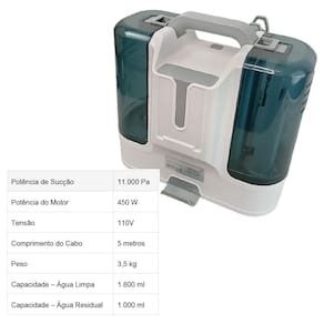 Este limpador de carpetes portátil possui design compacto, leve e destacável, com dois tanques de água independentes — 1,8L para água limpa e 1L para resíduos — garantindo praticidade no uso, fácil armazenamento e excelente portabilidade. Com motor de 450W, sucção superpotente e nível de ruído abaixo de 76dB, é ideal para uso doméstico, comercial e automotivo, permitindo aspirar e remover com eficiência manchas difíceis em carpetes, sofás, pisos, colchões, cortinas, interiores de carros e brinquedos, incluindo urina de animais, vinho tinto, mel e café. Além disso, pode ser utilizado apenas como aspirador de pó quando não há necessidade de pulverização de água, oferecendo ainda mais versatilidade na limpeza.