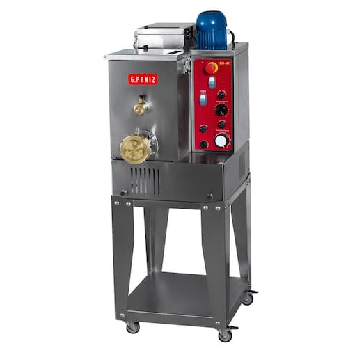 A Extrusora de Massas Gpaniz 40kg Trifásico 220V EM 40 é uma máquina de alto desempenho, ideal para a produção de massas frescas em restaurantes, casas e fábricas de massas. Com capacidade de extrusão de 35 a 40kg de massa por hora, ela é perfeita para quem busca eficiência e qualidade na produção de massas. A Extrusora possui 10 velocidades para o batedor e cortador, e um sistema mecânico com redutor industrial acoplado ao motor de1 1/2 CV + 1/2 CV. Além disso, ela conta com um ventilador de baixo ruído com alta vazão para a pré-secagem da massa, conexões para passagem de água para resfriamento do bocal do extrusor e suporte móvel para a bandeja.