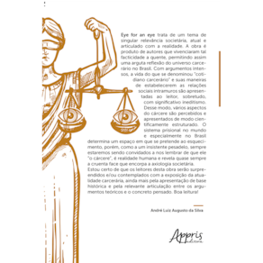 Eye for an eye trata de um tema de singular relevância societária, atual e articulado com a realidade. A obra é produto de autores que vivenciaram tal facticidade a quente, permitindo assim uma arguta reflexão do universo carcerário no Brasil. Com argumentos intensos, a vida do que se denominou “cotidiano carcerário” e suas maneiras de estabelecerem as relações sociais intramuros são apresentadas ao leitor, sobretudo, com significativo ineditismo. Desse modo, vários aspectos do cárcere são percebidos e apresentados de modo cientificamente estruturado. O sistema prisional no mundo e especialmente no Brasil determina um espaço em que se pretende ao esquecimento, porém, como a um insistente pesadelo, sempre estaremos sendo convidados a nos lembrar de que ele “o cárcere”, é realidade humana e revela quase sempre a cruenta face que encorpa a axiologia societária. Estou certo de que os leitores desta obra serão surpreendidos e/ou contemplados com a exposição da atualidade carcerária, ainda mais pela apresentação de base histórica e pela relevante articulação entre os argumentos teóricos e o concreto pensado. Boa leitura!